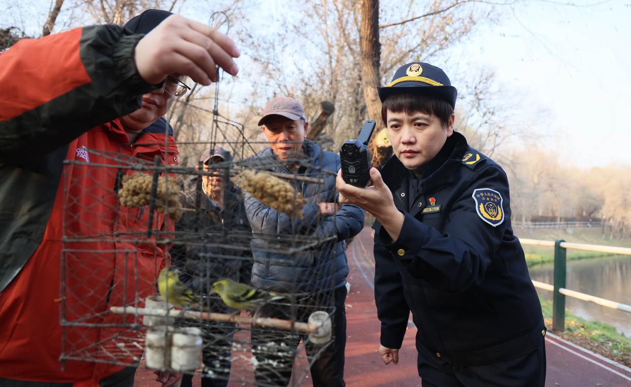 哈尔滨野保志愿者团队志愿者协助执法人员对非法捕猎的鸟类留证(2024年10月27日摄)。新华社发(张树摄)