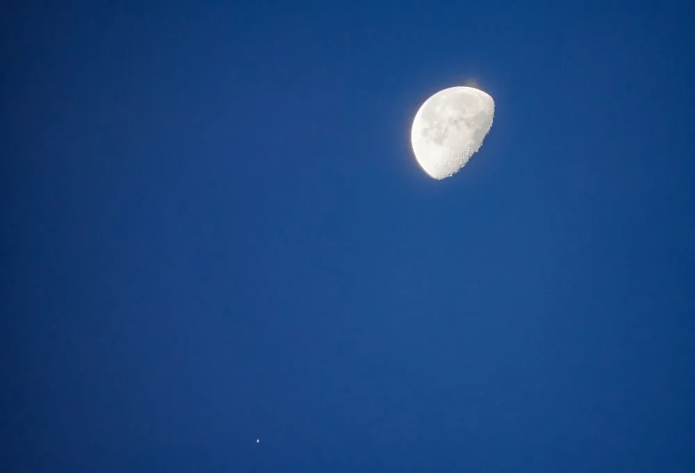 2024年11月21日,在北京丰台区拍摄的火星(左下)伴月。(王俊峰 摄)