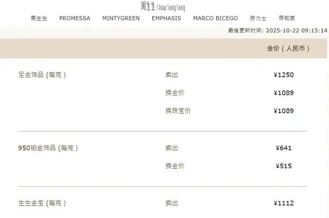 周生生足金饰品报价1250元/克,较前一日下跌39元/克;