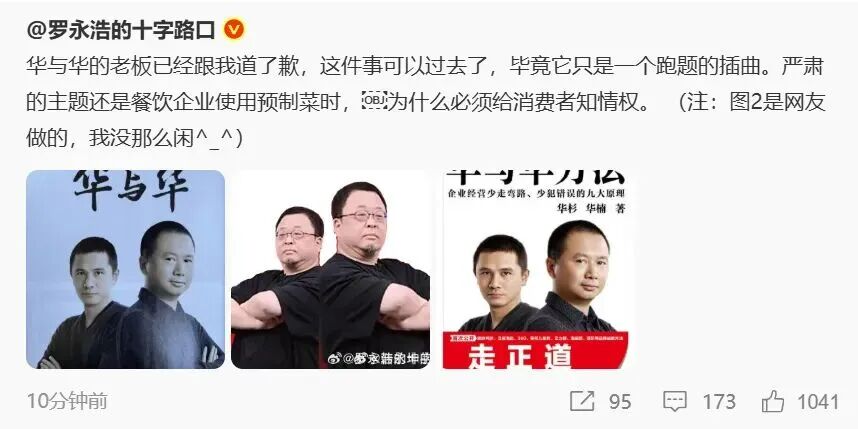 9月15日,罗永浩微博发文称:华与华的老板已经跟我道了歉,这件事可以过去了,毕竟它只是一个跑题的插曲。严肃的主题还是餐饮企业使用预制菜时,为什么必须给消费者知情权。