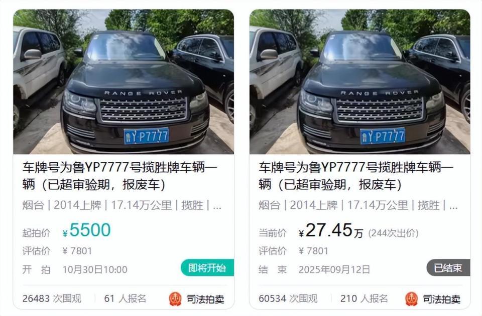 22日,记者注意到,在阿里拍卖平台上,一台车牌号为鲁YP7777的报废路虎越野车,将以5500元的价格挂网拍卖,目前已有57名竞买人报名参拍。
