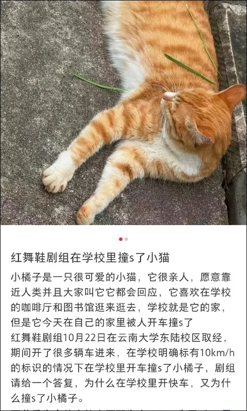 近日,网传《红舞鞋》剧组车辆在云南大学拍摄期间撞死了校园内小猫“小橘子”,引发热议。