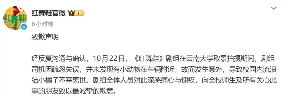 23日凌晨,剧组发布致歉声明,称司机因疏忽未发现有小动物在车辆附近,故而发生意外。目前司机已引咎辞职,剧组还将以小橘子的名字成立基金用于校内流浪动物保护。