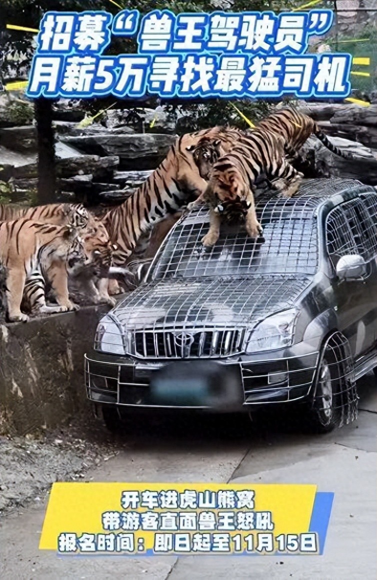此前,“竹海野生动物园”官方账号发视频称招募“兽王驾驶员”,月薪5万寻找“最猛司机”,需要开车进虎山熊窝,带游客直面兽王怒吼,报名时间截至11月15日。
