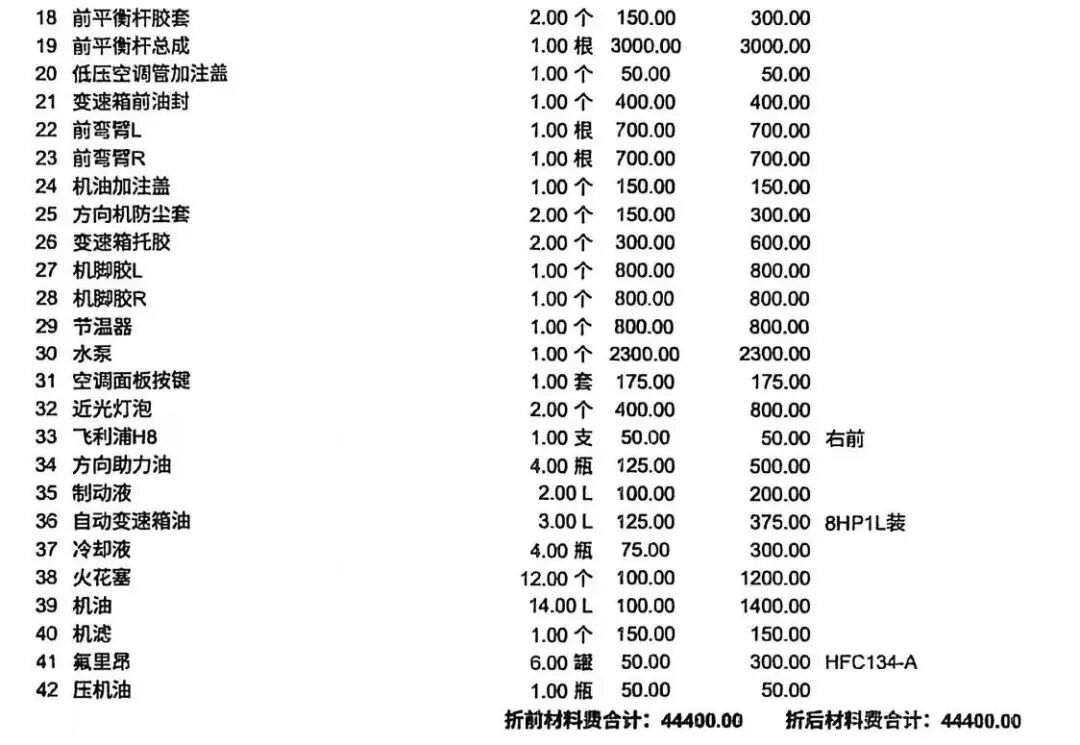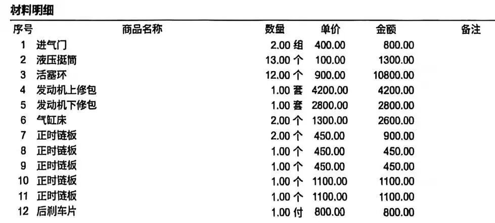 记者在该清单上看到,在服务费(即工时费)方面,吊装发动机3000元,镗缸、镶缸套6000元,维修方向机2400元等;材料费方面,1个水泵2300元,1根前平衡杆总成3000元,1个发动机上修包4200元,12个活塞环共10800元等。