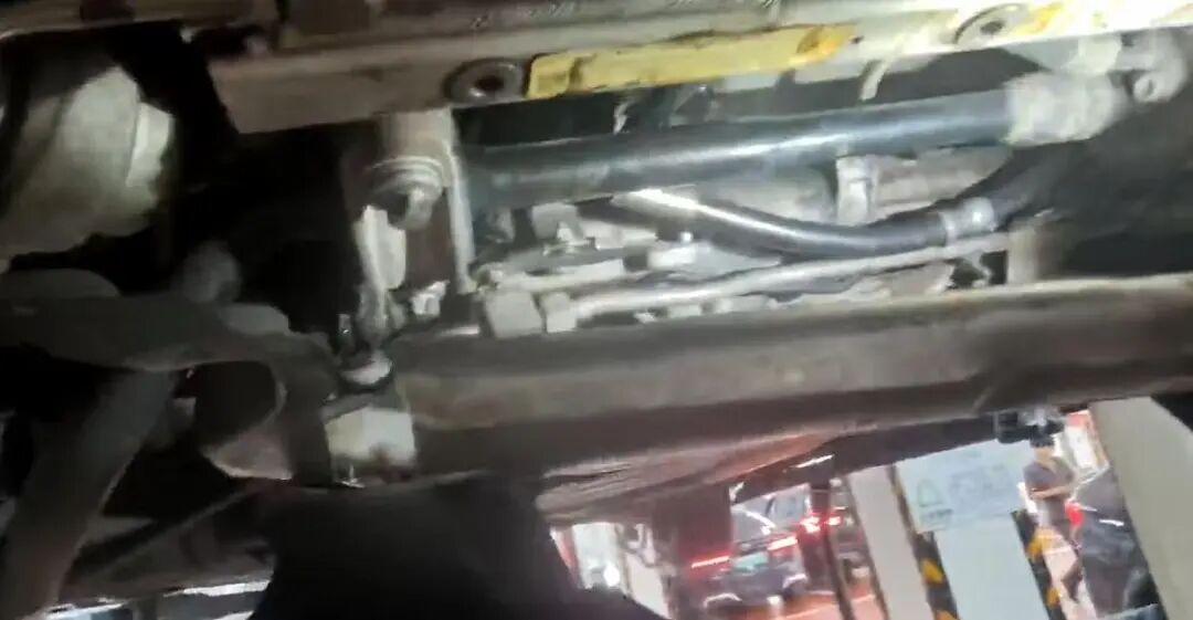 蓝先生提供的一段该4S店检修视频显示,车辆底部扣件松动脱离,管件未固定,行驶时发出异响磨损。