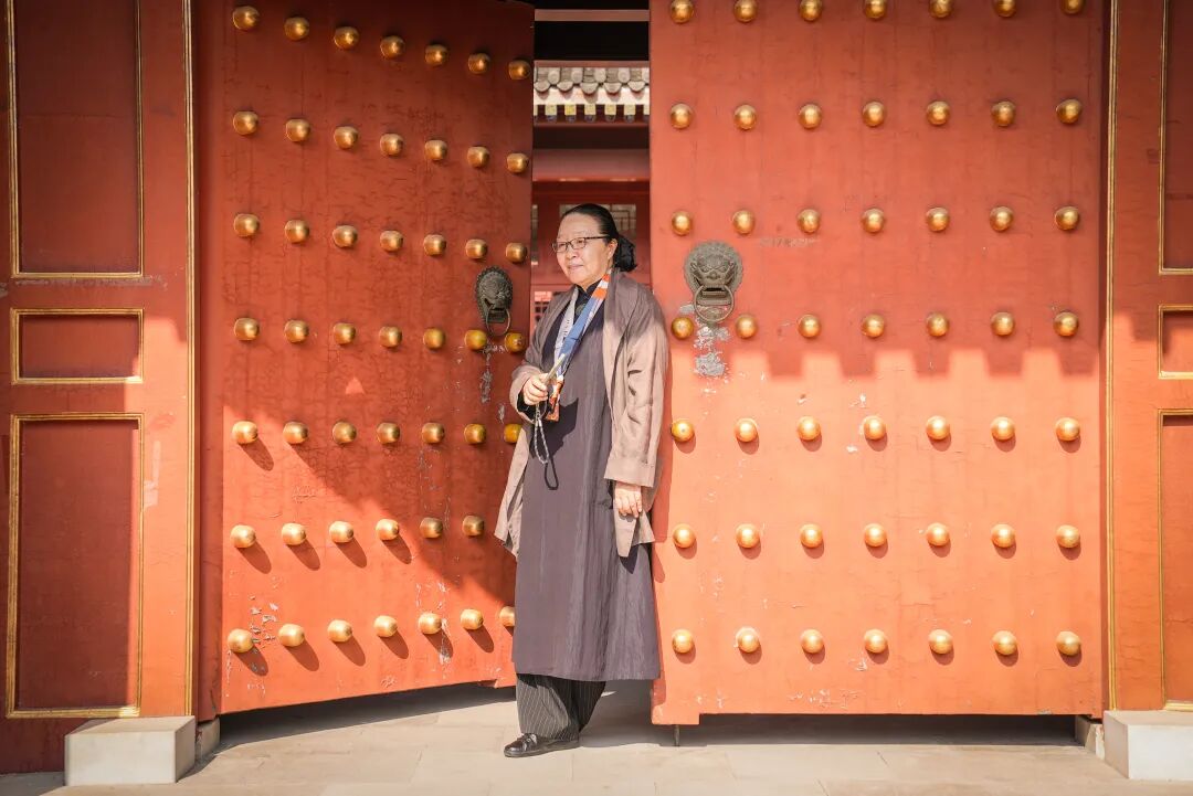 戴锦华教授在北大人文学苑门口。北京日报客户端记者武亦彬摄