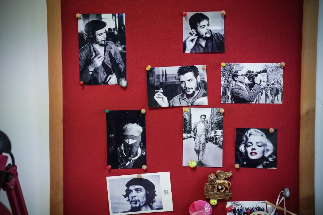 戴锦华书桌旁的软木板上贴着她的“偶像”切·格瓦拉的照片。北京日报客户端记者武亦彬摄