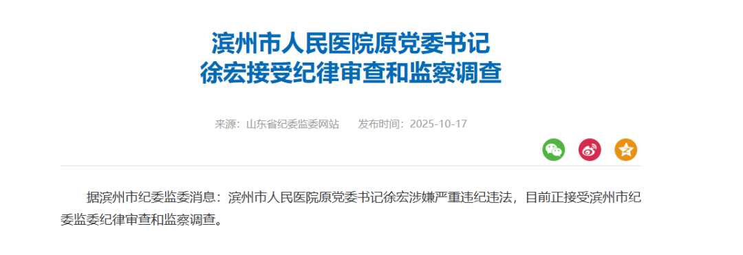 据滨州市纪委监委消息:滨州市人民医院原党委书记徐宏涉嫌严重违纪违法,目前正接受滨州市纪委监委纪律审查和监察调查。