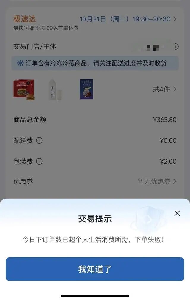 近日,有网友发帖称,其使用山姆APP线上购物结算时,页面弹出“今日订单数已超个人生活消费所需,下单失败!” 的提示。该网友在评论区补充说明,当天已通过山姆APP提交了9笔订单。不少网友在评论区表示曾遇到过同样的情况,“应该是一天内买太多了”或者“是不是地址太多了”,还有网友分享经验称“正常情况下,一天顶多买3单”。