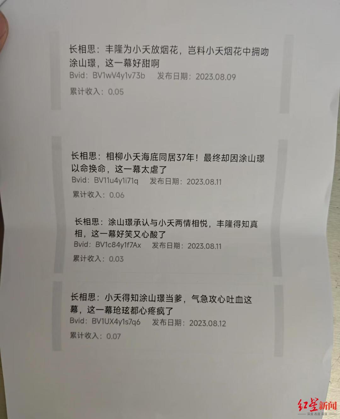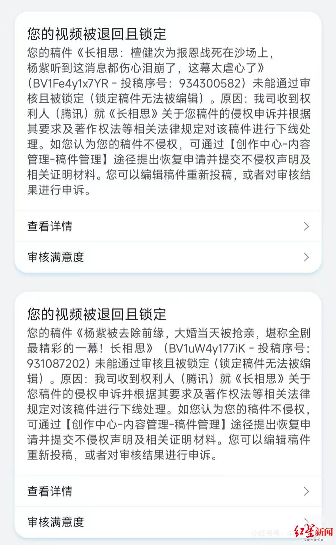 梁先生出示了4条涉案视频的发布信息,均发布于2023年8月,标题句式为“长相思:……这一幕……”累计收入分别为0.05元、0.06元、0.03元、0.07元。两条《长相思》相关稿件的退稿消息显示,梁先生的视频稿件未能通过平台审核且被锁定,原因为:“我司收到权利人(腾讯)就《长相思》关于您稿件的侵权申诉并根据其要求及著作权法等相关法律规定,对该稿件进行下线处理。”