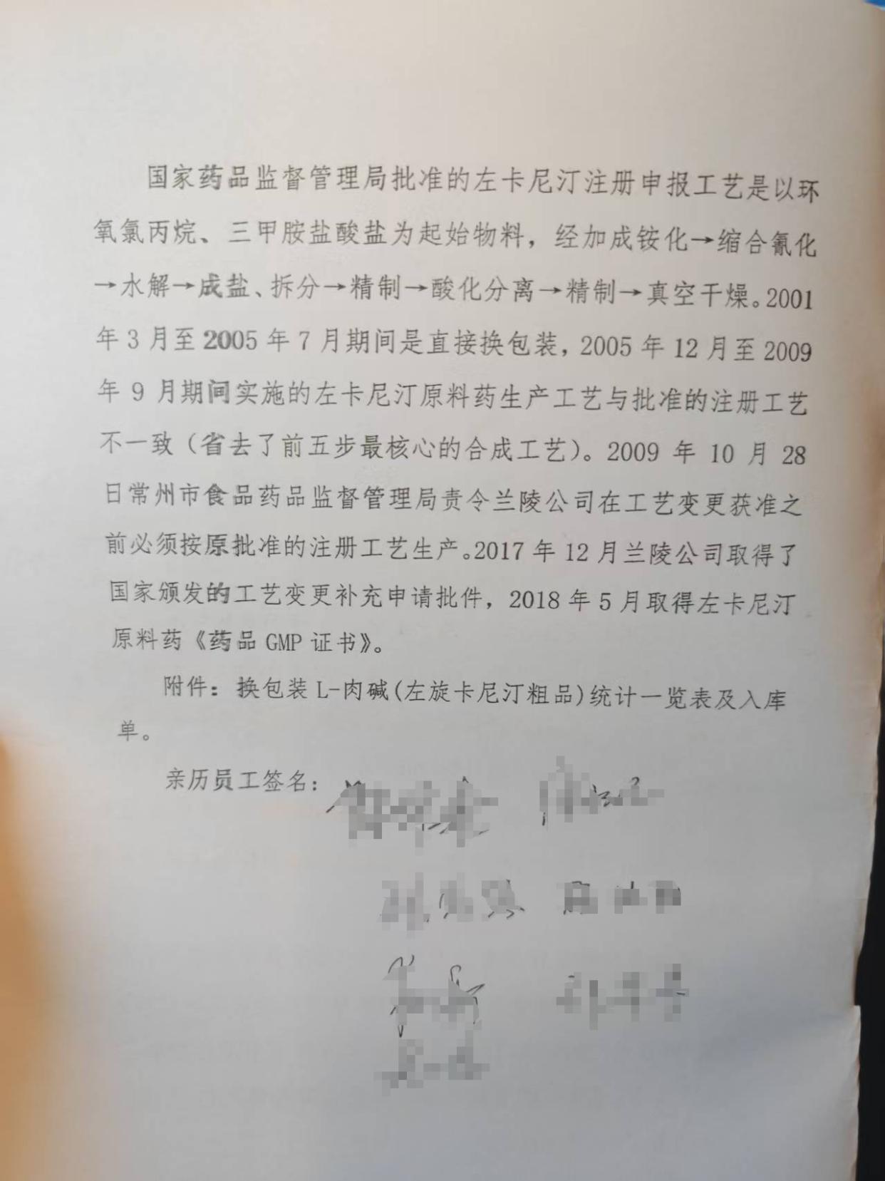 为了证实自己的说法,虞小平提供了多份药厂工人签字并按了手印的证明材料。多位药厂的一线工人证实,从2001年3月到2009年9月,兰陵制药生产的左卡尼汀注射液的原料是一家化工厂生产的L-肉碱。2005年7月之前,是直接更换外包装后使用;2005年7月开始,增加了一道“精烘包”的物理工序,但是原料仍是化工厂生产的成品L-肉碱。