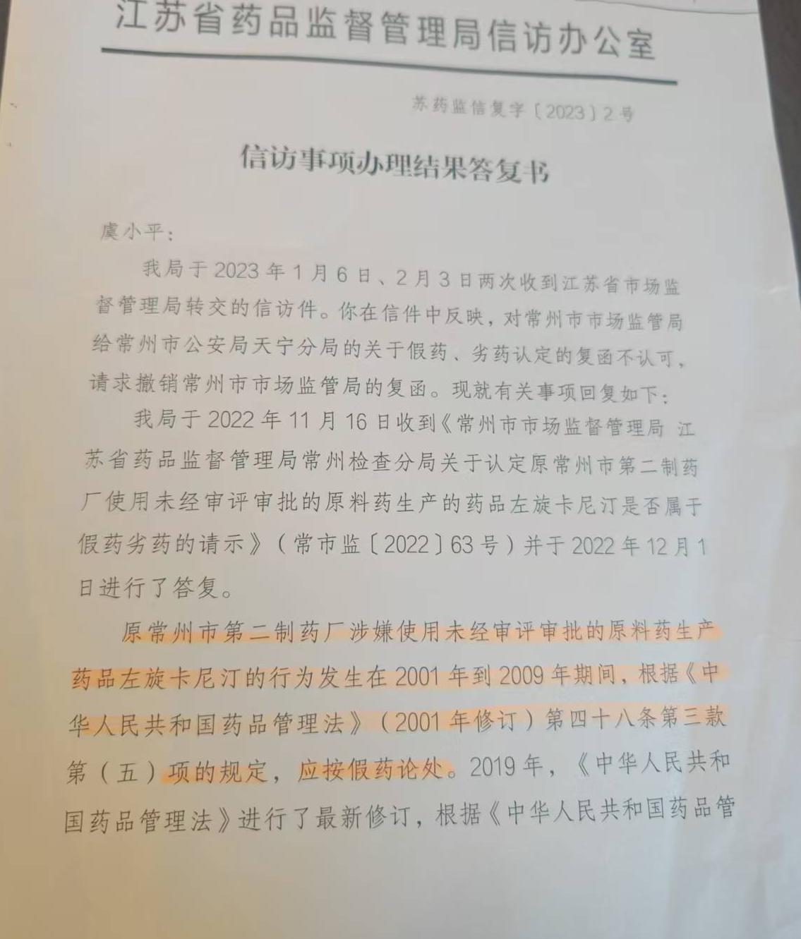 虞小平称,提前终止了与三维公司的合作后,兰陵制药和三维公司在此后的十多年里,进行了多场诉讼。他也一直在举报三维公司涉嫌用非药化工产品生产“假药”。但直到2023年2月,江苏省药品监督管理局才在给他作出的信访答复中认定:“原常州市第二制药厂涉嫌使用未经审评审批的原料药生产药品左旋卡尼汀的行为发生在 2001 年到 2009 年期间,根据《中华人民共和国药品管理法》(2001年修订)第四十八条第三款第(五)项的规定,应按假药论处。”
