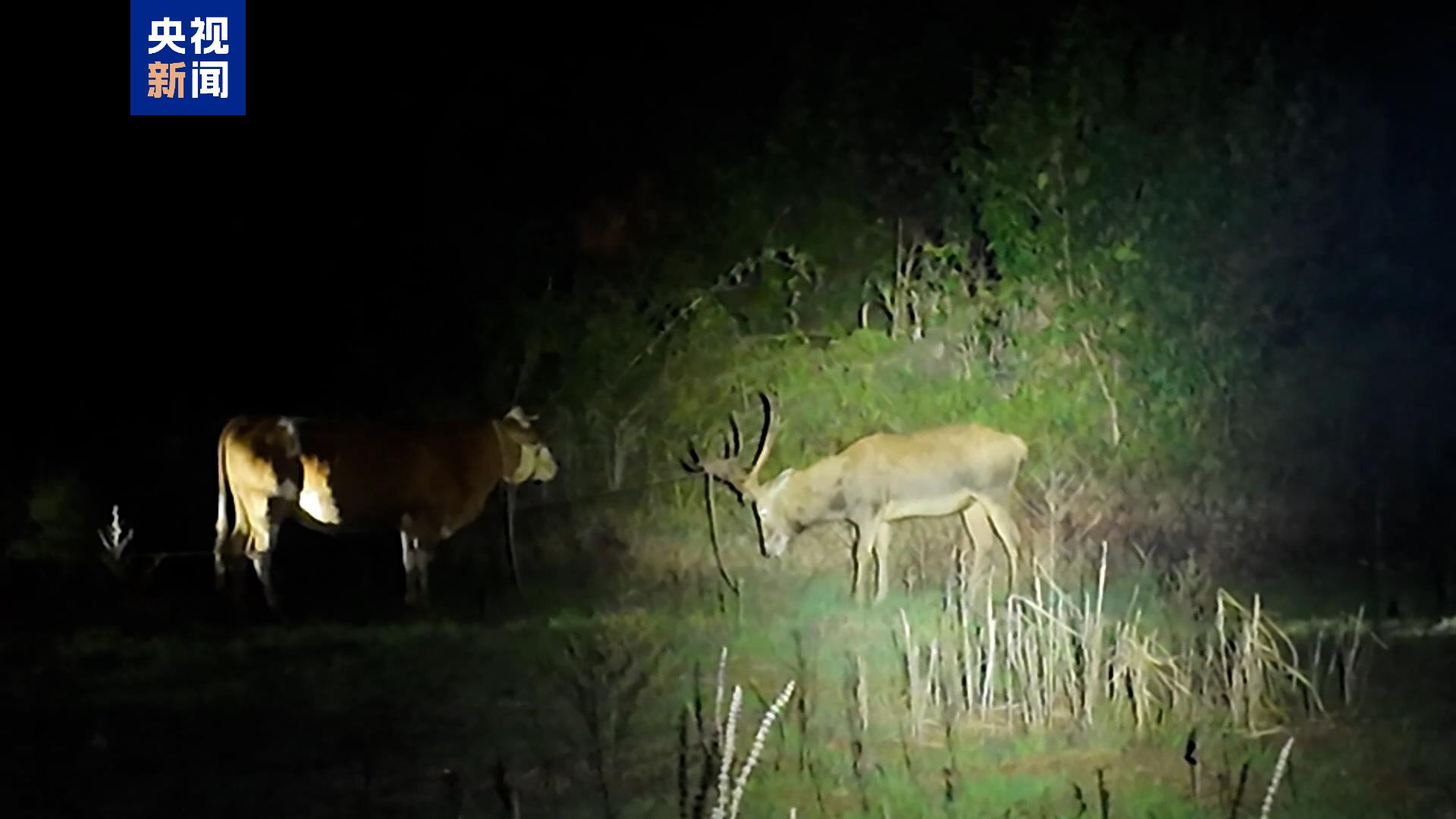 10月21日傍晚,一头成年雄性麋鹿在湖南岳阳县鹿角村与牛的缰绳缠在了一起,在这头雄壮的麋鹿奋力挣扎下,牛毫无抵抗之力,被一点一点带向洞庭湖洲滩深处。岳阳县林业部门工作人员监测到这一现象后,第一时间赶往现场。