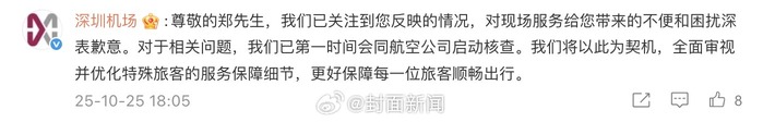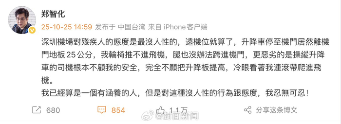 10月25日,歌手@郑智化 发文控诉称,其在深圳机场登机时,因升降车停离机门地板25公分,轮椅推不进飞机,只能连滚带爬进飞机。随后,@深圳机场 在评论区致歉,并表示已第一时间会同航空公司启动核查。