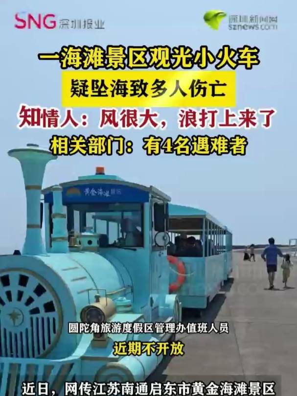 据潇湘晨报报道,近日有消息称,江苏南通启东市黄金海滩景区附近疑似发生一起观光小火车坠海事故,致多人伤亡。