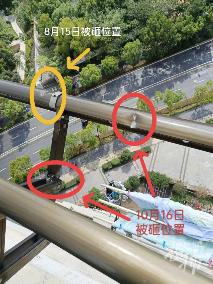 3幢高层大姐家的晾衣架2次被外立面砸中凹陷变形