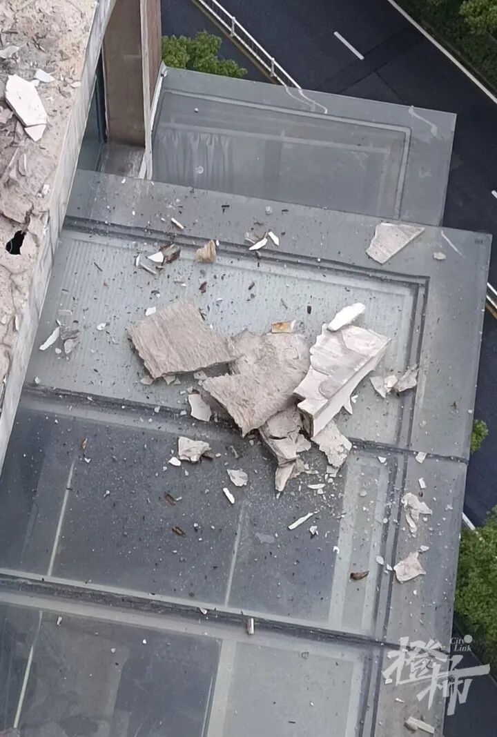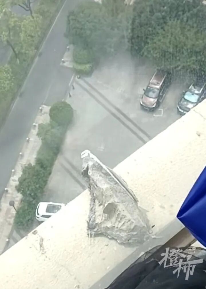 “我们6月中旬才入住的,短短4个多月,先后两次被脱落的外立面碎块砸中,太慌了。我们住在高层,晾衣架钢管都能砸变形,如果砸到一楼不是更严重?”