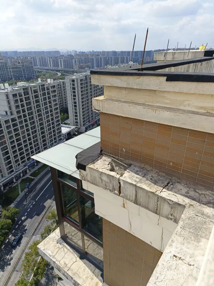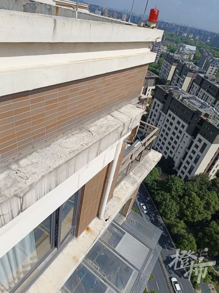3幢共20层,记者上到楼顶看到,被砸的晾衣架上方楼顶,入眼就是一堆外墙脱落的碎块,向下看,楼层上方有一圈外檐装饰条,表面布满裂痕,转角处整段外檐装饰条已出现缺失,绕顶楼一圈,上述情况普遍存在。