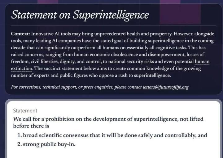 “超级智能的前景已经引起了人们的关注,其影响从人类经济的落伍和权力的剥夺,自由、公民权利、尊严和控制权的丧失,到国家安全风险,甚至可能导致人类灭绝。”签名者们严正警告。倡议明确指向,超级智能并非传统意义上的“算法偏见”或“就业冲击”问题,而是潜在的系统性风险;一旦AI能力全面超越人类,其目标函数若与人类利益错位,可能导致不可逆的社会后果。