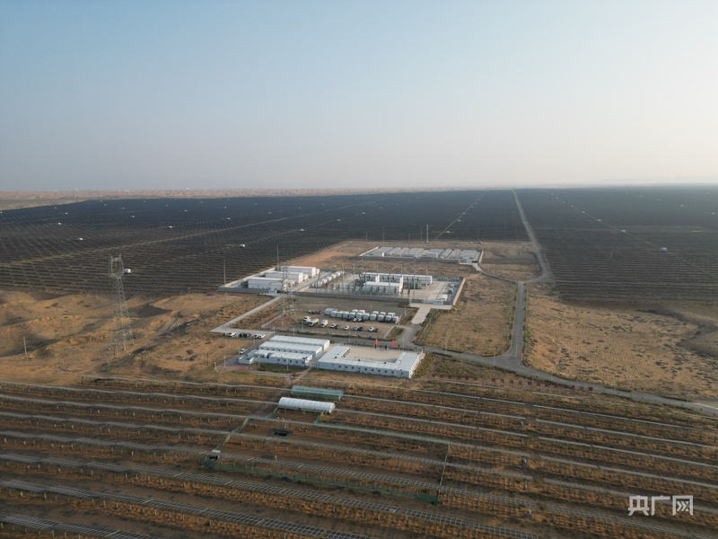 位于中卫市的宁夏腾格里“沙戈荒”新能源基地,8万余亩光伏板如蓝色海洋般铺展(央广网发 陈开意 摄)