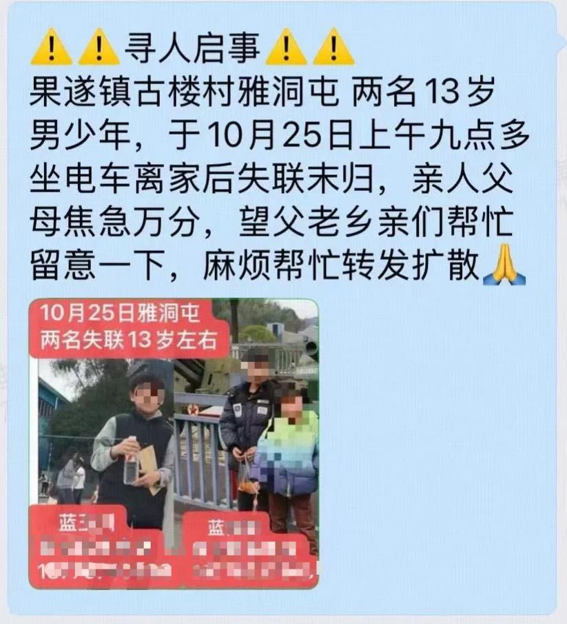 据家属发布的寻人启事,10月25日上午9时许,来宾市忻城县果遂镇古楼村雅洞屯两名13岁男孩骑电瓶车离家失联未归,希望网友帮忙提供线索。