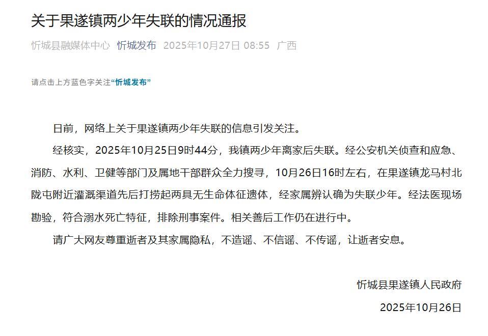 另据忻城县果遂镇人民政府稍早前发布情况通报:经核实,2025年10月25日9时44分,我镇两名少年离家后失联。经公安机关侦查和应急、消防、水利、卫健等部门及属地干部群众全力搜寻,10月26日16时左右,在果遂镇龙马村北陇屯附近灌溉渠道先后打捞起两具无生命体征遗体,经家属辨认确为失联少年。经法医现场勘验,符合溺水死亡特征,排除刑事案件。相关善后工作仍在进行中。