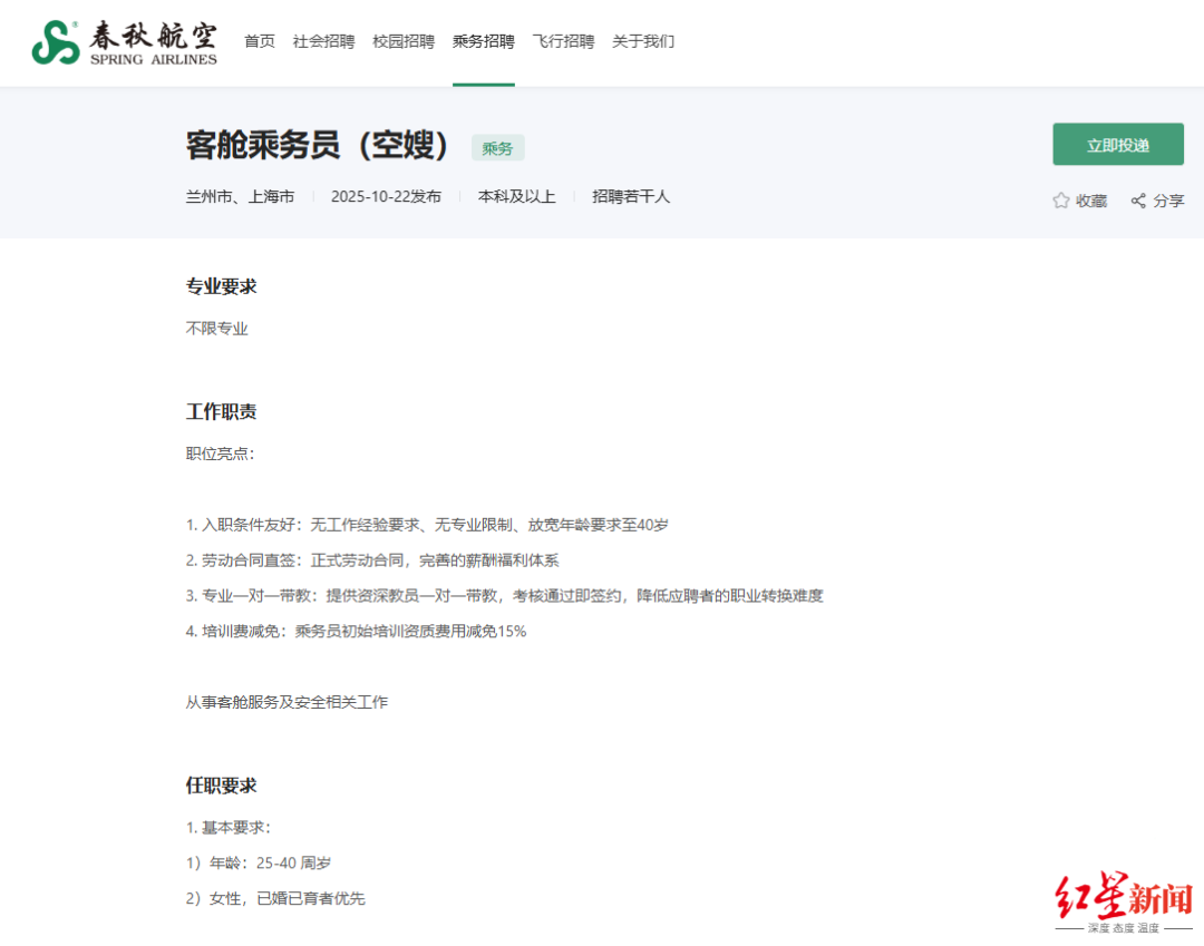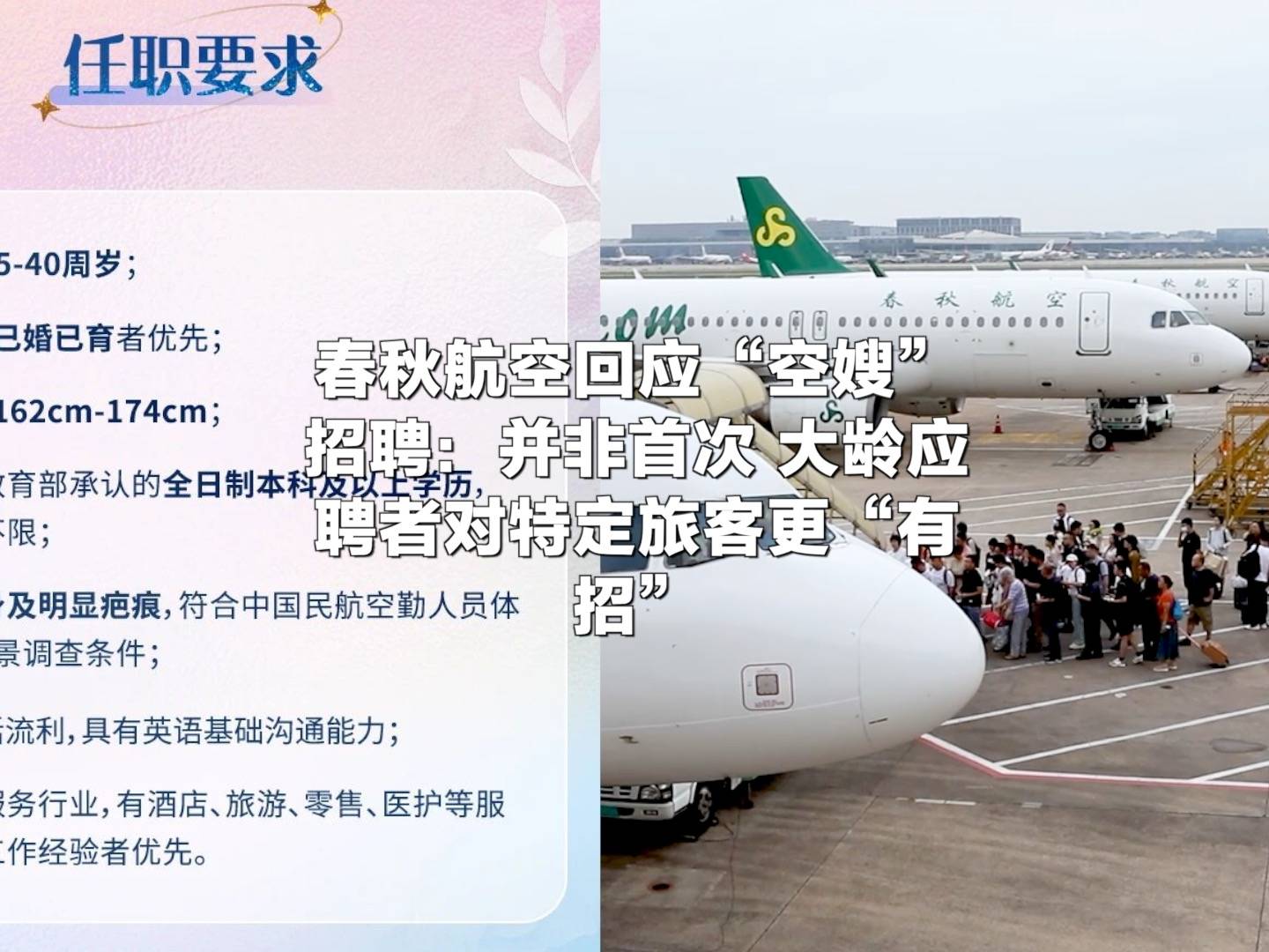 10月27日,微博话题#春秋航空开招已婚已育空嫂#登上热搜。据了解,此前春秋航空在兰州举行的招聘新闻发布会上,宣布启动“空嫂”专项招聘,面向已婚已育女性开放客舱乘务员岗位,年龄放宽至40岁,学历要求为全日制本科及以上,身高162cm至174cm,无工作经验限制。