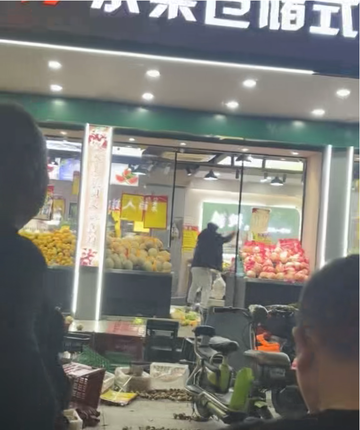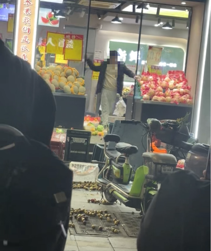 现场视频显示,一名穿滑雪服的男子情绪激动地将水果摔满地,然后踉踉跄跄地趴倒在店门口,现场有不少围观者。