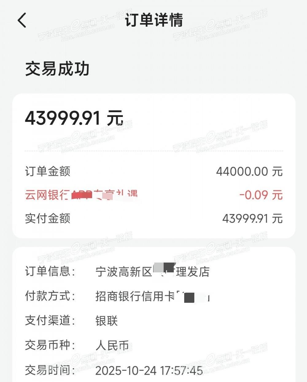 ▲网友晒出的支付账单,一笔通过银联支付44000元