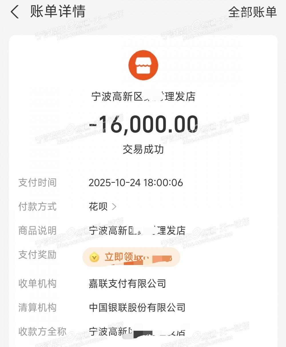 ▲网友晒出的账单,另一笔16000元用花呗支付