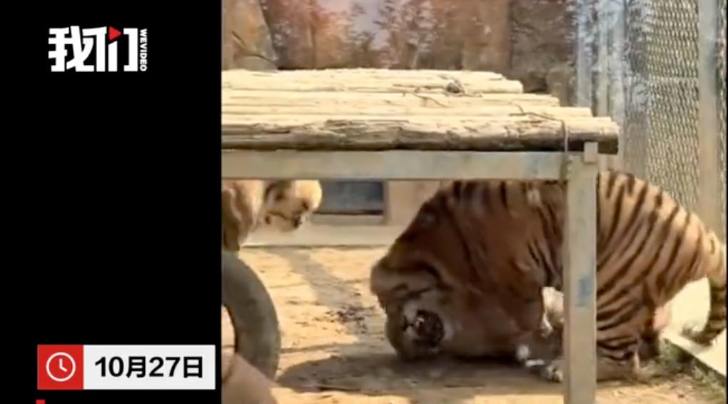 10月27日,游客拍下安徽皖南野生动物园一狮子遭老虎撕咬,狮子头部有血迹。