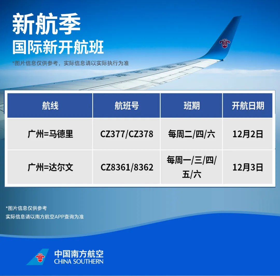 国际及地区方面,南航计划于12月2日起新开广州-马德里、12月3日起新开广州⇌达尔文国际长航线。