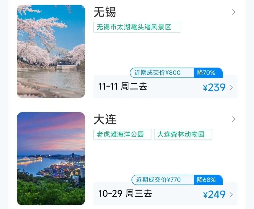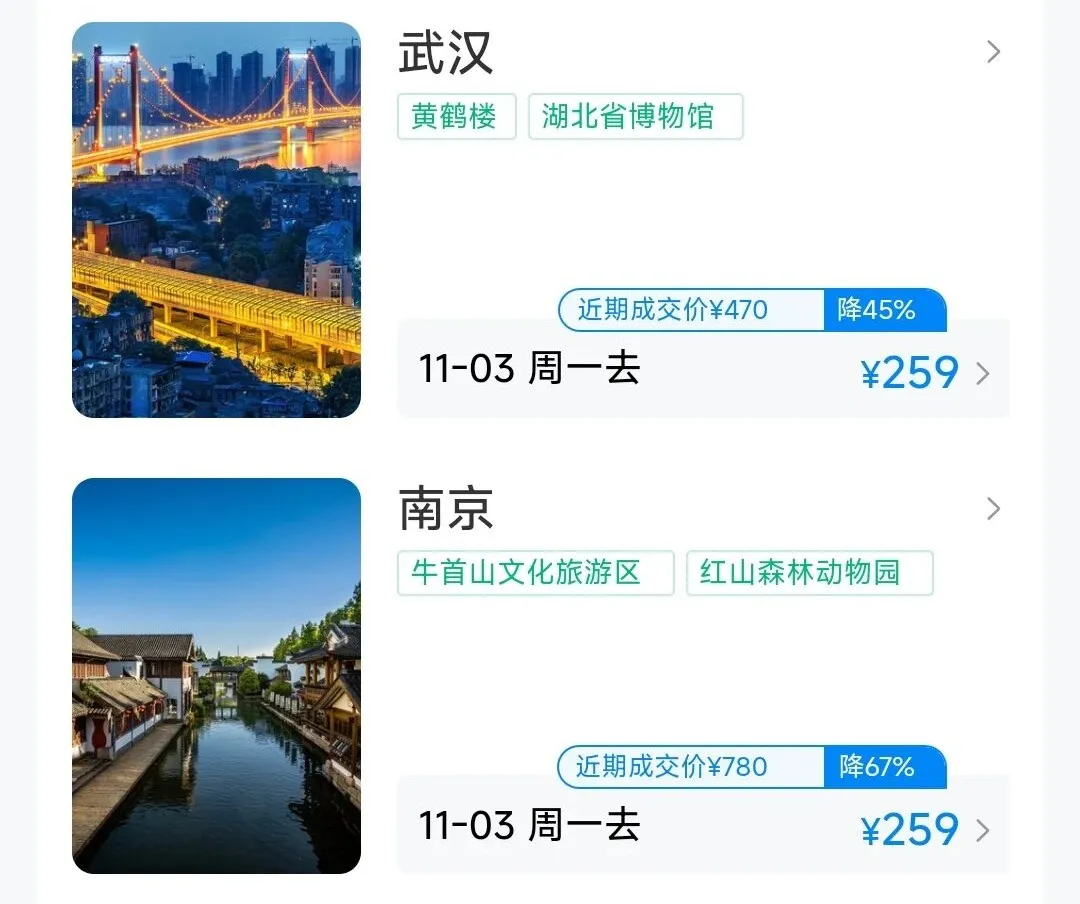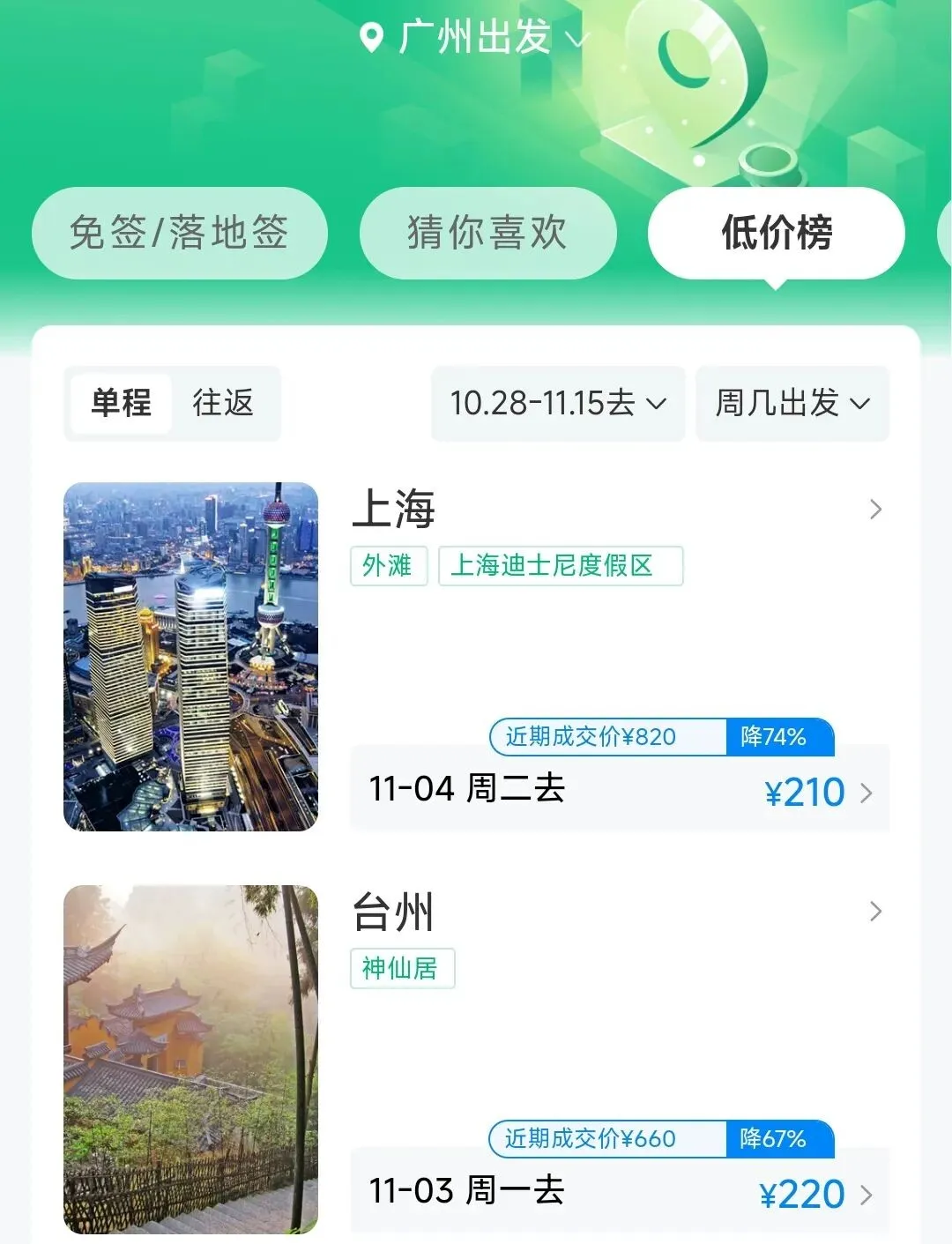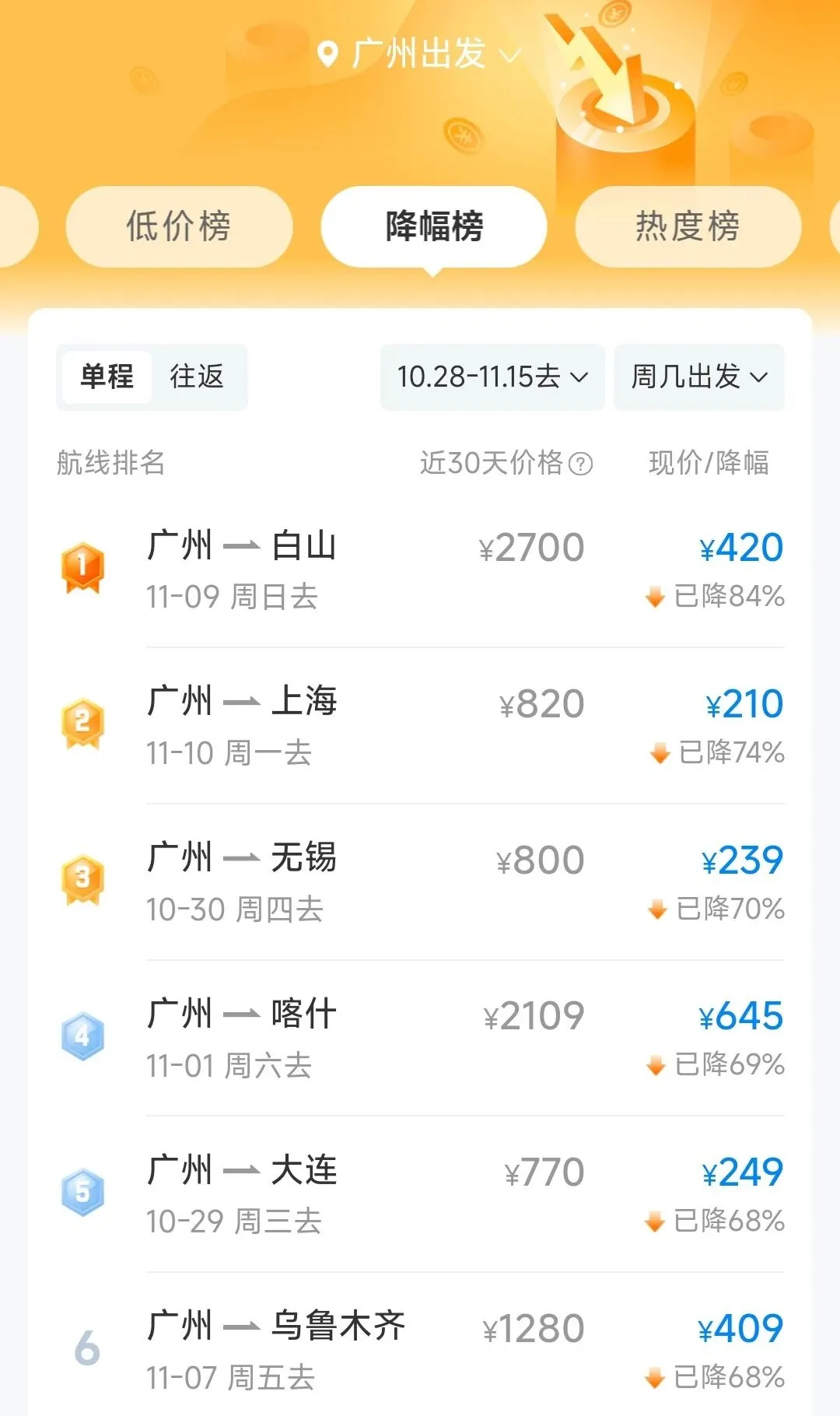 小编通过查询第三方售票平台发现,十月下旬至十一月广州出发前往上海、无锡、大连、武汉、南京等地的机票价格大幅下降,最高降幅达84%。
