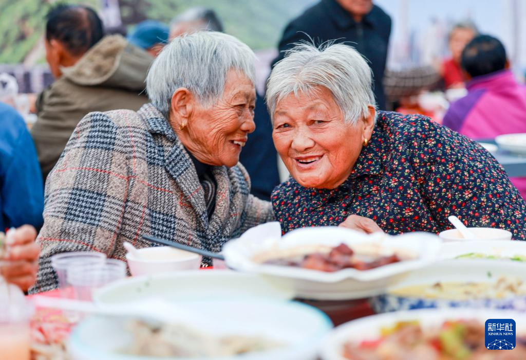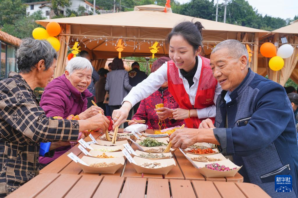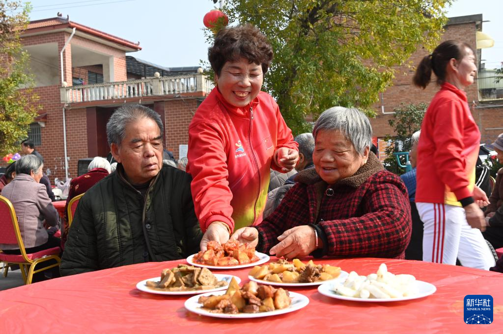 10月27日,在河南省沁阳市西万镇留庄村举办的“九九重阳节,浓浓敬老情”迎重阳主题活动中,志愿者为老人摆上“长寿宴”菜品。