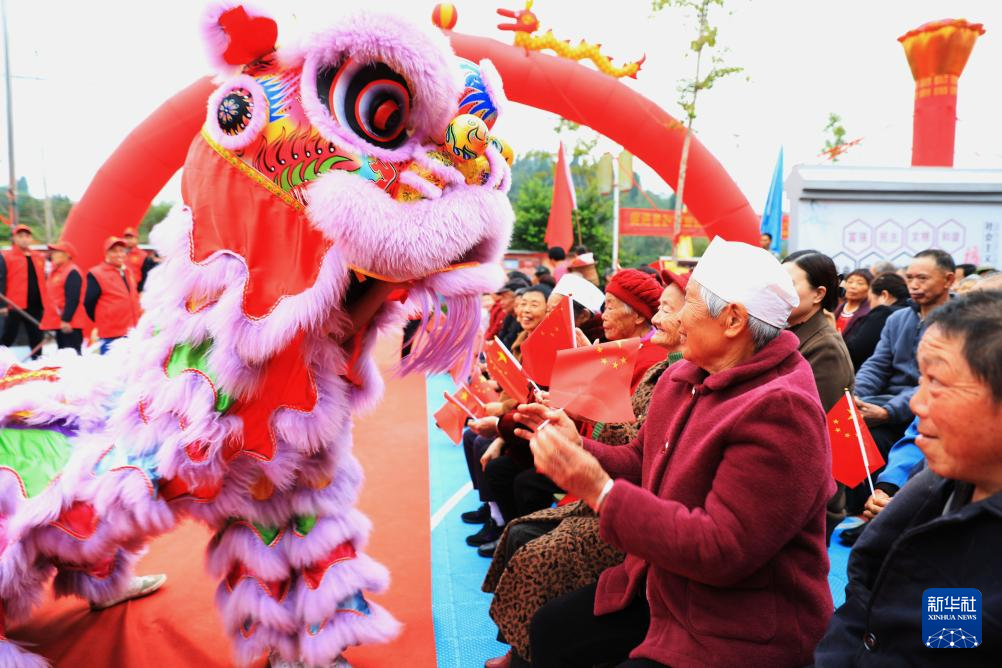 10月26日,在四川省达州市达川区双庙镇魏塘坡村庆祝重阳节活动中,民间艺人为老人们进行狮舞表演。