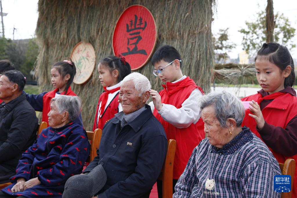 10月26日,在江苏省海安高新区隆政街道联合村俞万家庭农场举办的“金秋稻田 相遇重阳”稻田游园会敬老仪式上,小志愿者为老人梳头。