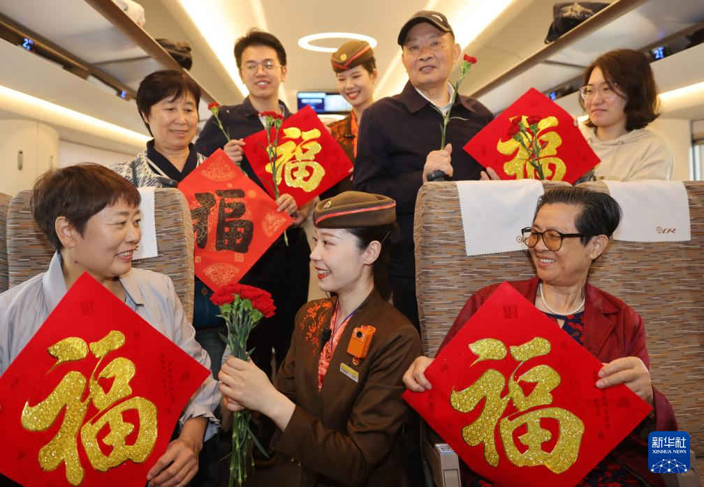 10月10日,在武汉开往大冶北D7007次列车上,武汉铁路工作人员给老年旅客赠送康乃馨鲜花。