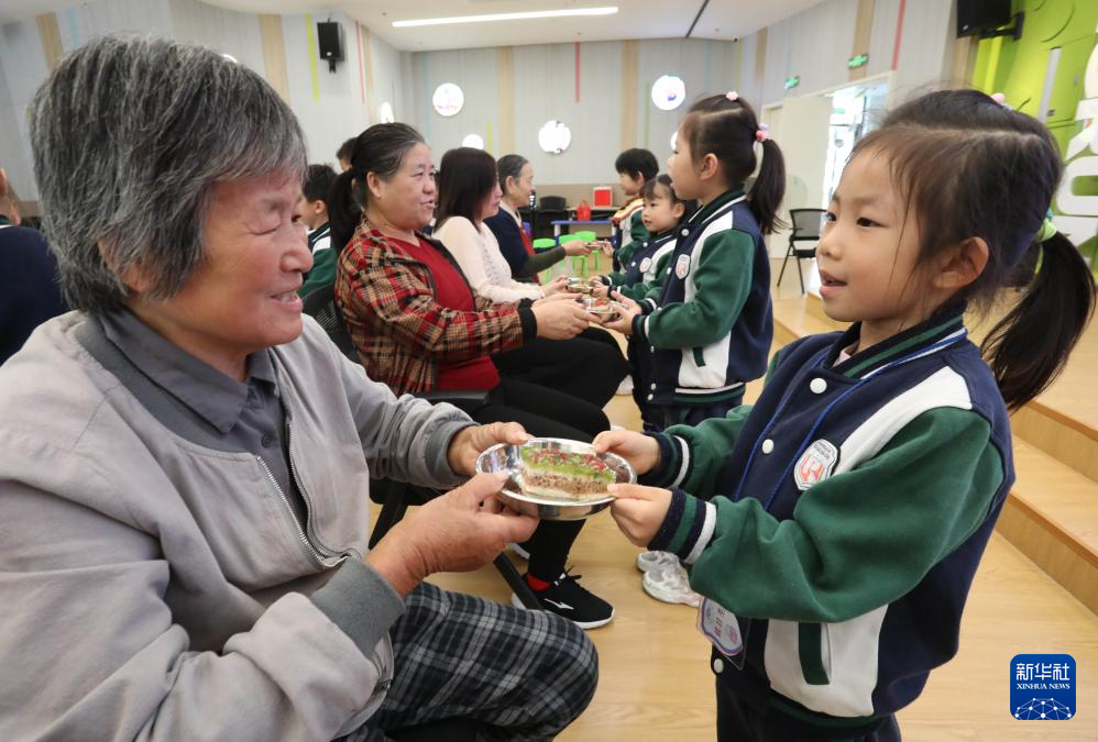 10月27日,在江苏省苏州市姑苏区平润实验幼儿园,小朋友为长辈送上重阳糕。