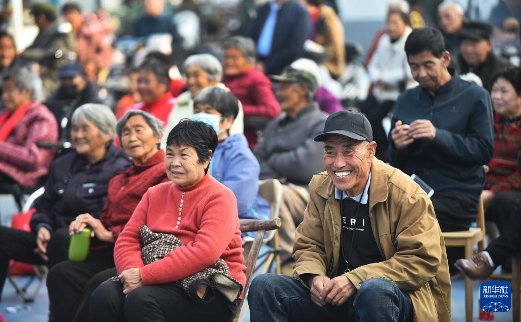 10月26日,老人们在河南省洛阳市涧西区工农街道大所社区文化广场举行的重阳节公益演出活动上欣赏豫剧节目。