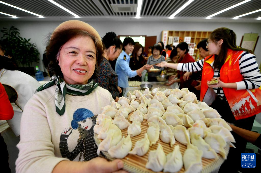 10月27日,在青岛市崂山区金家岭街道鲁信长春社区开展的迎重阳敬老活动上,老人展示包的饺子。