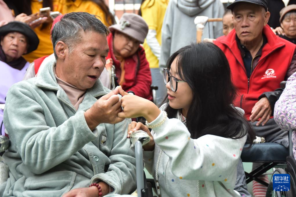 10月25日,在云南省蒙自市爱心养老院,志愿者和老人一起做手指操。