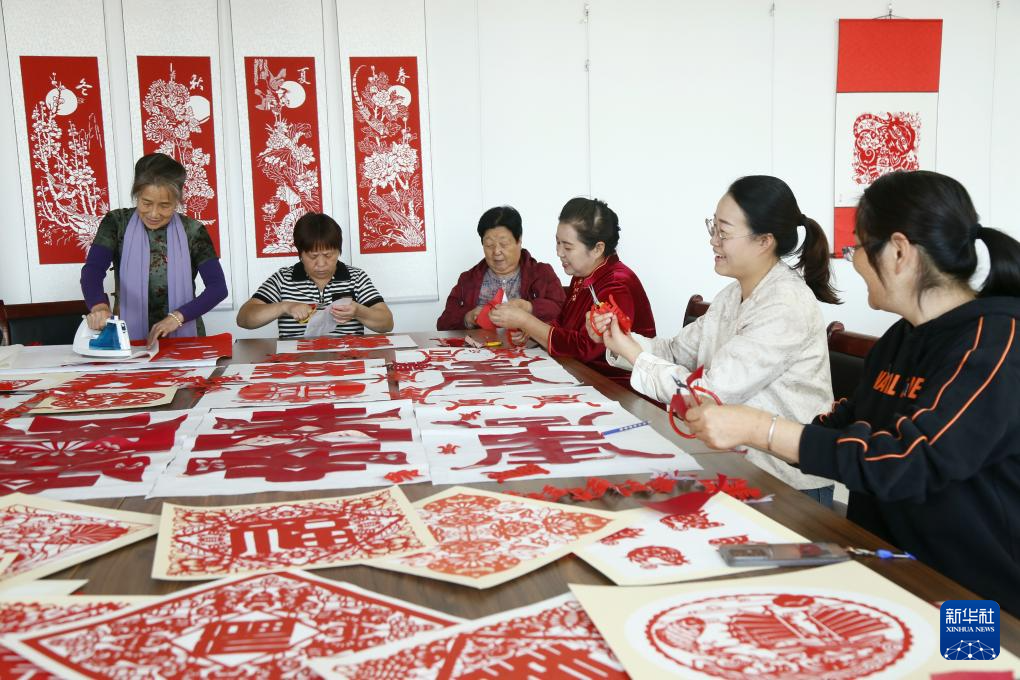 10月10日,在河南省洛阳市汝阳县人民文化馆,剪纸协会人员给社区老人剪祝福语。