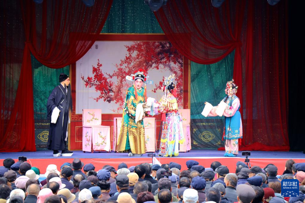 10月27日,在甘肃省平凉市静宁县体育场,群众观看来自陕西省戏曲研究院的演员表演秦腔。