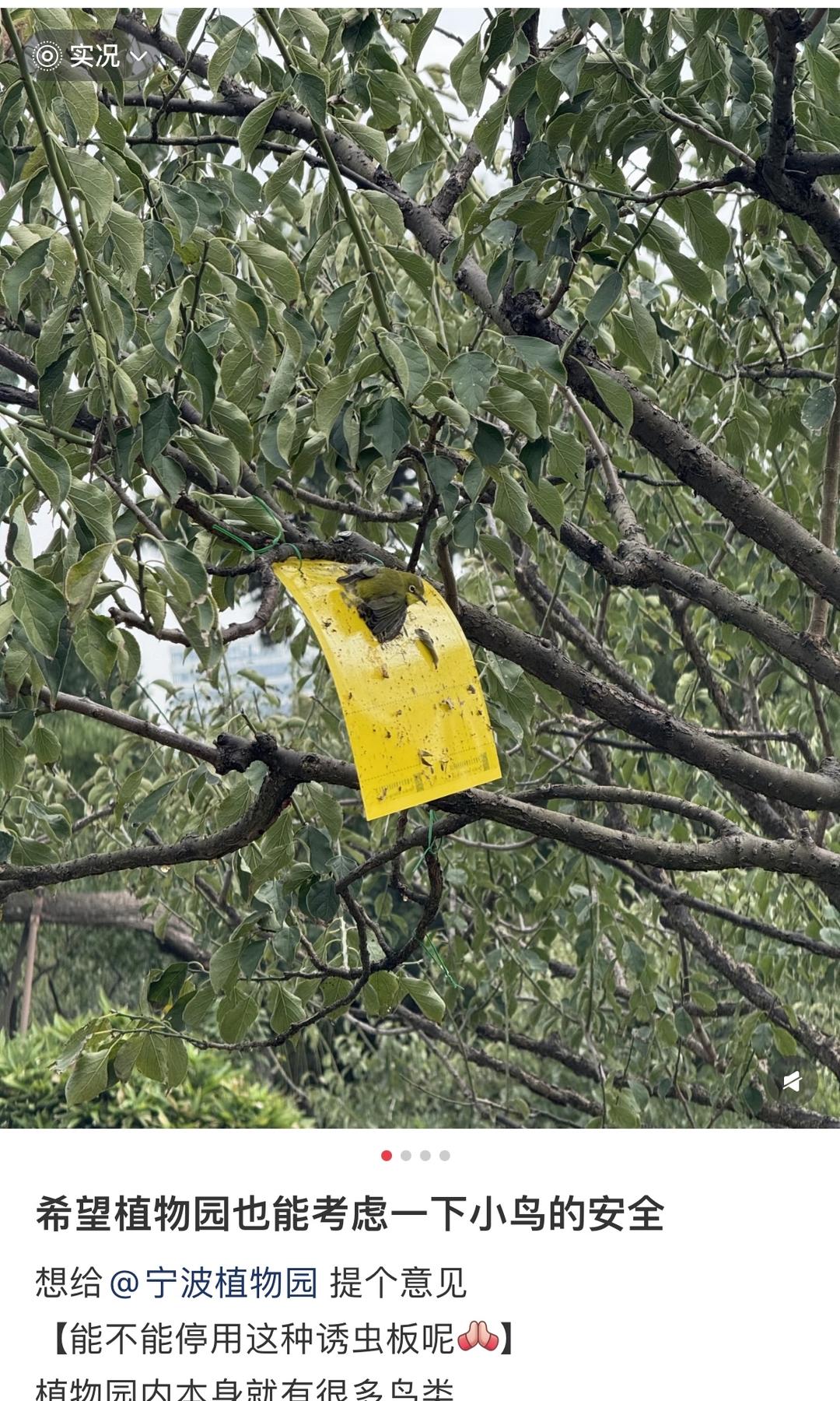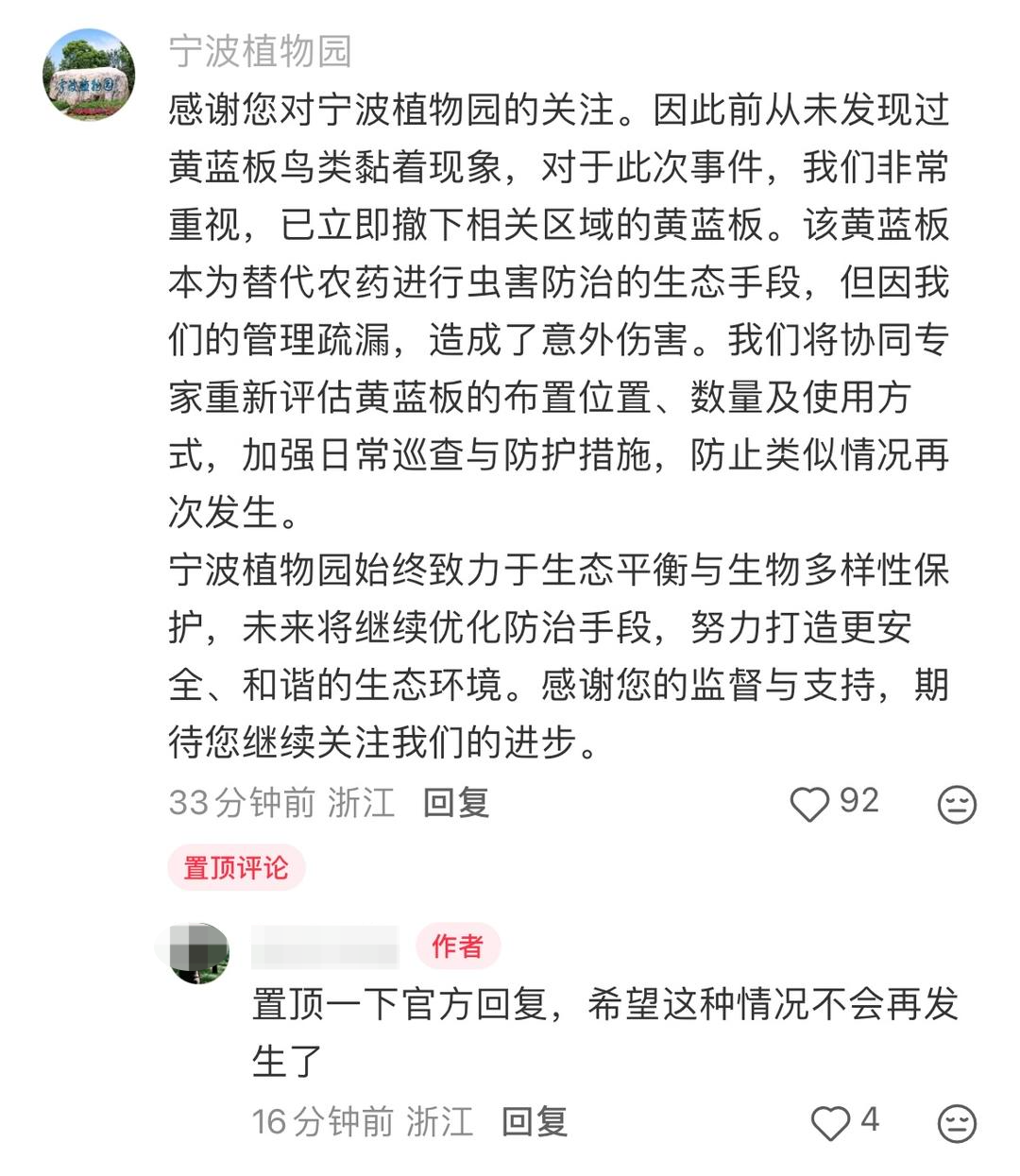 28日下午,宁波植物园在该网友的社交账号下公开回应此事称:感谢对宁波植物园的关注,因此前从未发现过黄蓝板鸟类黏着现象,对于此次事件,我们非常重视,已立即撤下相关区域的黄蓝板。该黄蓝板本为替代农药进行虫害防治的生态手段,但因我们的管理疏漏,造成了意外伤害。我们将协同专家重新评估黄蓝板的布置位置、数量及使用方式,加强日常巡查与防护措施,防止类似情况再次发生。