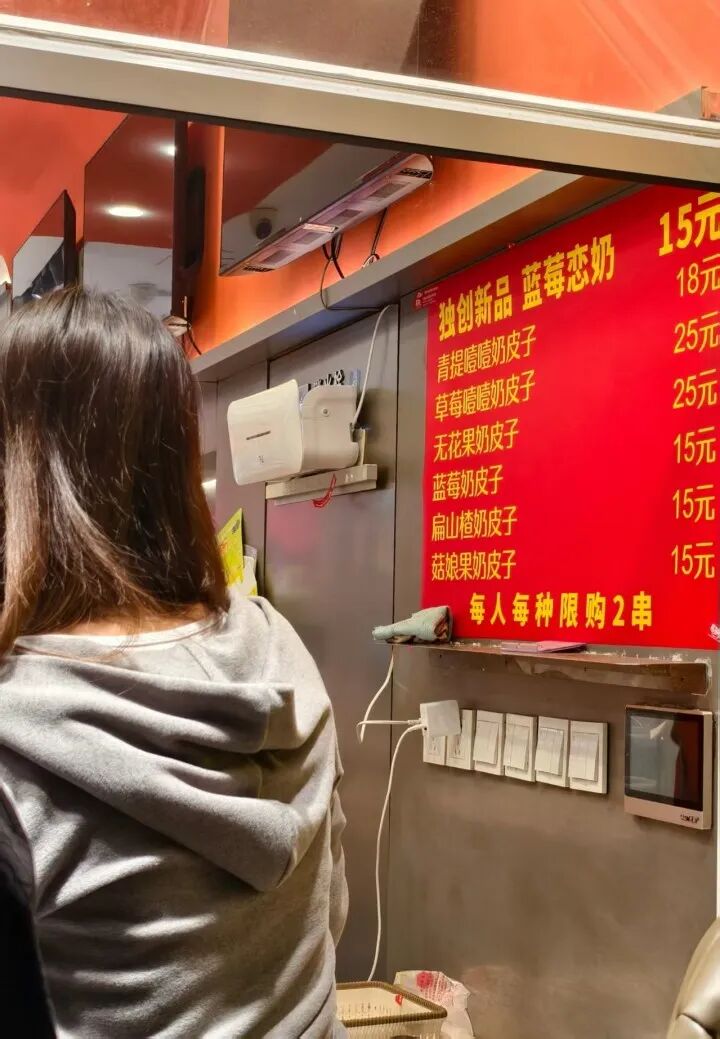 等了15分钟,队伍才往前挪了两三米,记者往队伍最前面凑了凑,发现店员正在熬糖浆,琥珀色的糖浆冒着泡,要等凉到合适的温度才能裹糖葫芦,每一串都得现做。门店玻璃上还贴着“新品每人每种限购2串”的提示,难怪速度慢。