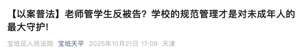 据微信公号“宝坻天平”消息,2025年6月,某高中学生唐某一纸诉状将学校及三位老师告上法庭,其称“我在走廊掉了手机,老师不让捡还‘控制’我”,并要求老师公开赔礼道歉。