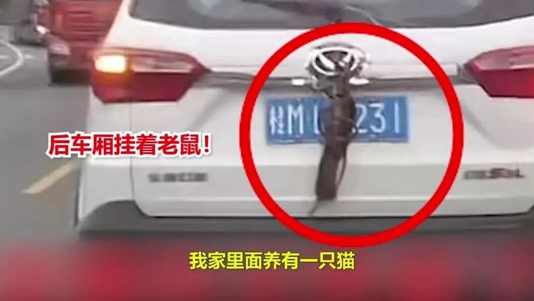 何某交代,他家里养了一只猫,平时喜欢抓老鼠玩耍。当天早上他抓到两只老鼠准备给猫当“口粮”。担心老鼠放在后备箱会咬坏皮革,便用绳子将老鼠绑在一起,悬挂在后窗雨刮器上,以为这样既能通风,又可防止老鼠乱窜。没想到老鼠一路挣扎,越吊越低,竟把车牌给挡住了。