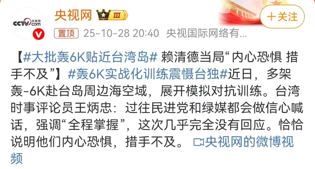据@央视网10月28日消息,近日,多架轰-6K赴台岛周边海空域,展开模拟对抗训练。相关话题冲上热搜↓