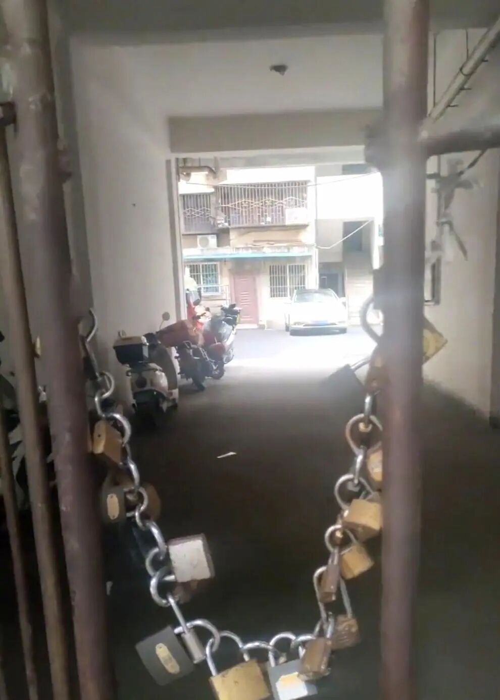 直到居民李女士,提出了“每家配一把锁”的办法,才打破了僵局。“我平时常看法制节目,里面有个情况和我们小区很像,我就跟大家商量,不如每家出一把锁,把这些锁串起来。车主开门时,只需要开自家那把就行,还能起到防护作用。”李女士介绍,29把锁串成锁链后,铁门会留出空隙,大家不用完全打开门,直接就能把电瓶车骑出去,也很方便。